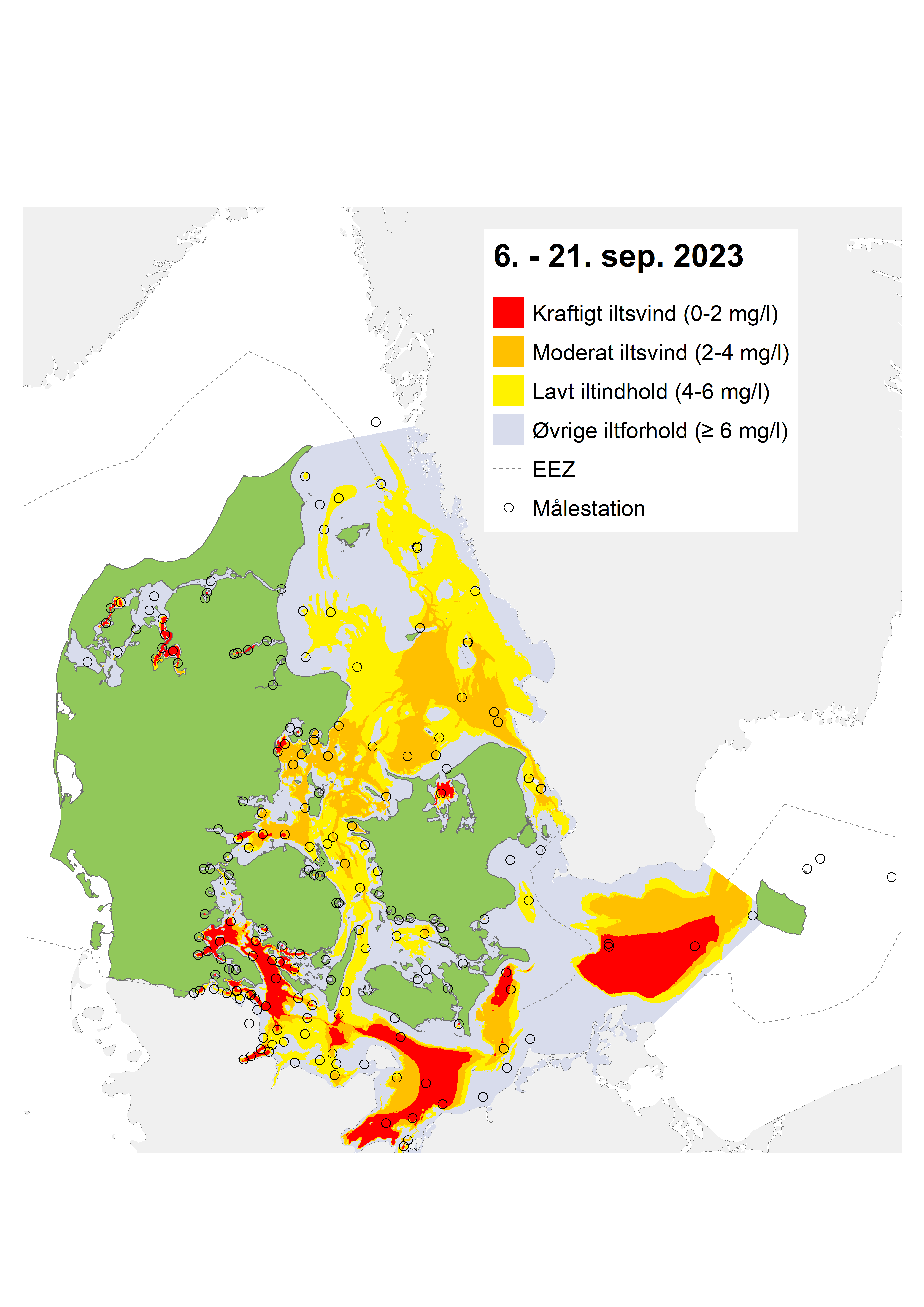 Осінь відзначилася найбільшою втратою кисню за понад 20 років, і наслідки цього були дуже помітні. Тисячі риб і тварин гинуть, а білий шар трупів, утворений сірчаними бактеріями на морському дні, осів на значній частині внутрішніх вод Данії.